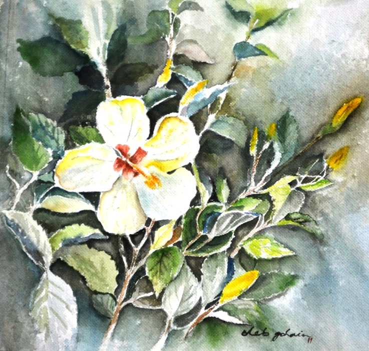 This is a water colour painting of a creeper wih beautiful pink flowers that bloom in autumn season in Assam and can be seen hanging from walls and fences of homes. Through vibrant colours of flowers and blooming in plentiful this creeper covers wide spaces turning an area into a spectacular sight for eyes.